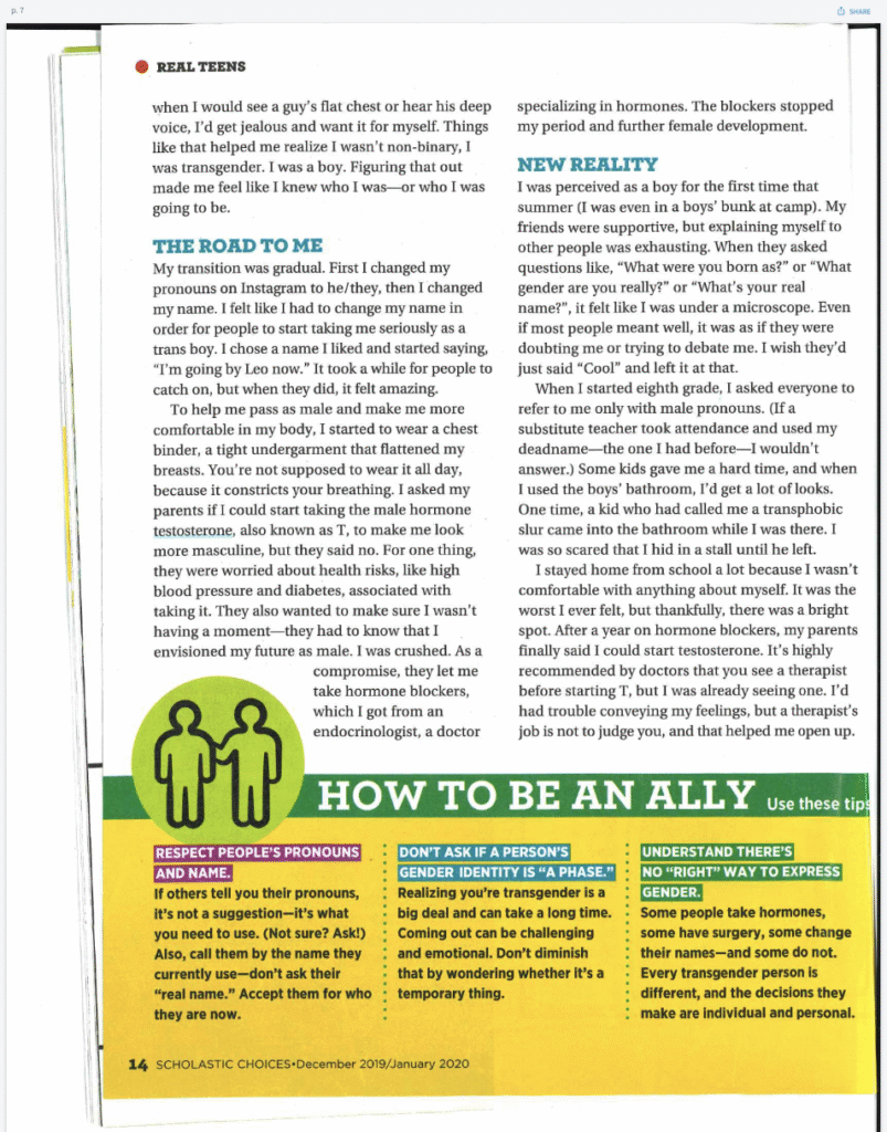 The piece includes a “gender glossary” defining terms like transgender, non-binary, and transition, and it ends with “How to Be an Ally” guidance that encourages readers to use correct names/pronouns, avoid calling gender dysphoria a phase, recognize there’s no single “right” transition path, not out someone, and speak up against bullying, plus a resource plug for The Trevor Project.