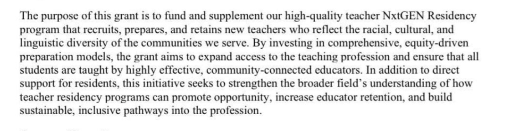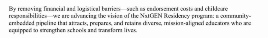 The document read, “we are advancing the vision of the NxtGEN Residency program: a community-embedded pipeline that attracts, prepares, and retains diverse, mission-aligned educators.”