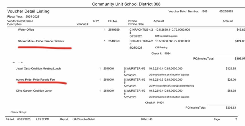During the timeframe of the partnership, the district spent taxpayer dollars on “DEI Improvement of Instruction Supplies” as well as “DEI Professional Services.” Specific items included “Pride Parade Stickers” as well as another item reading “Aurora Pride – Pride Parade Fee.”