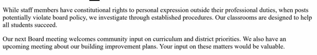 In a separate reply to one parent, the superintendent wrote, “While all staff members have constitutional rights to personal expression outside of their professional duties, when posts potentially violate board policy, we investigate through established procedures.”