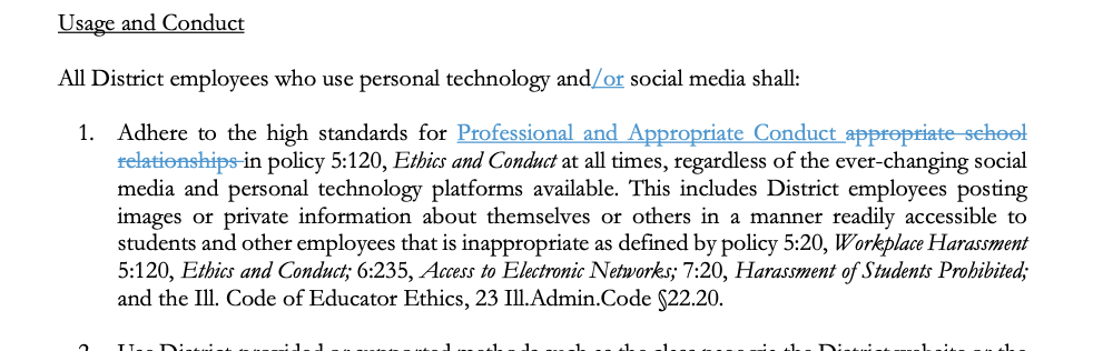 Pertinent policies for Oswego faculty members, referenced on the district’s website, call on employees to ” Demonstrate a high level of professional judgment.” Both faculty members remain in their roles as of 2026. Additionally, the district requires that all employees who use personal technology and/or social media must adhere to the standards for Professional and Appropriate Conduct at all times.
