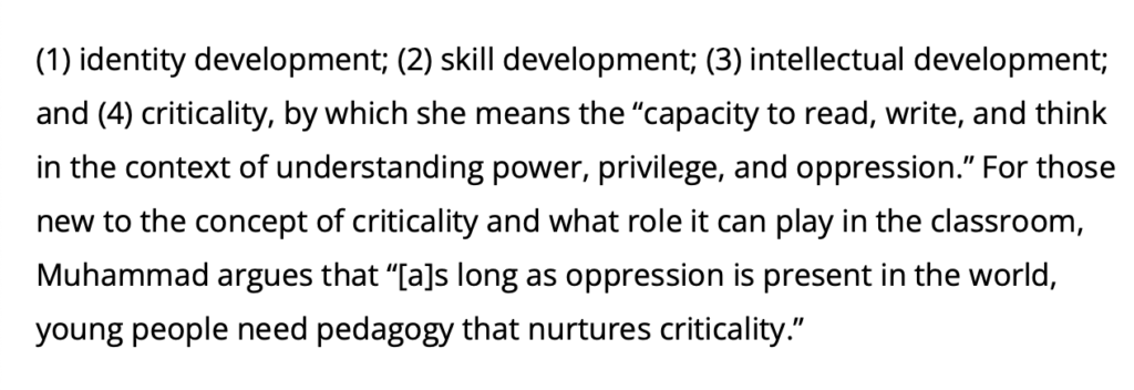 Muhammad argues that youth literacy is inextricably linked to oppression: “‘[the] capacity to read, write, and think in the context of understanding power, privilege, and oppression.'” Furthermore, one of the “5 Pursuits of Learning” includes “criticality.” For Muhammad, this means: “‘[A]s long as oppression is present in the world, young people need pedagogy that nurtures criticality.'”