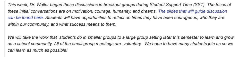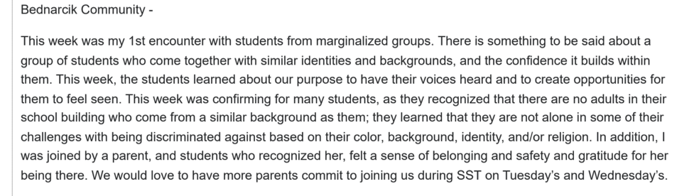 Following her meeting with students, the equity director wrote, “This week was my 1st encounter with students from marginalized groups. There is something to be said about a group of students who come together with similar identities and backgrounds, and the confidence it builds within them.”