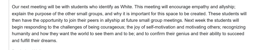 The equity director continued, sharing that her next meeting would be with students “who identify as White” in order to “encourage empathy and allyship” and “explain the purpose of the other small groups.”