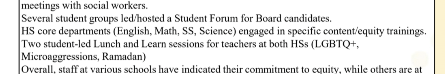 According to the equity report, “Junior High engaged in at least two trainings throughout the year” related to “Personal and Instructional dimensions of equity.” Moreover, middle school students received two equity trainings. High school core departments also held “specific content/equity training.” In addition to specific training, high school students also received Lunch & Learn opportunities centered on “LGBTQ+, Microaggressions, Ramadan.”