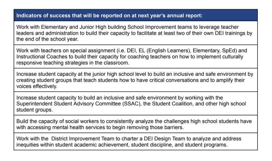 This report also revealed the district’s plans for evaluating success in 2026. The success indicators include: more DEI trainings in the elementary and middle school, more culturally responsive teaching strategies in the classroom, and the creation of a DEI Design Team “to analyze and address inequities within student academic achievement, student discipline, and student programs.”