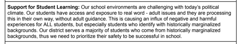 The paragraph continues, “Our district serves a majority of students who come from historically marginalized backgrounds, thus we need to prioritize their safety to be successful in school.”