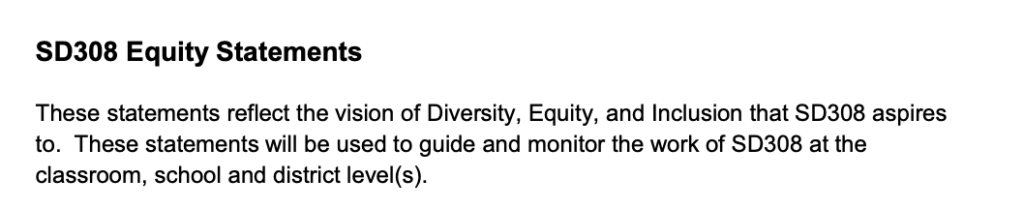 District 308’s 2025 Annual Report Summary on DEI, obtained via FOIA, revealed that students from elementary through high school participated in trainings related to “Personal and Instructional dimensions of equity.” For elementary students, this included “the Cultivating Genius cohort training for the 5 Pursuits of Learning.”