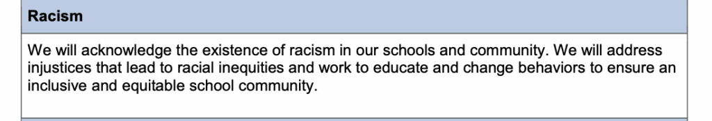 The “District Equity Statements” include “Curriculum,” “Racism,” “Marginalized Identities,” “Recruitment and Retention of Staff,” “Student Voice,” “Professional Development,” “Climate for Learning,” “Policy,” and “Community Partnerships.” Under the “Racism” section, the policy reads, “We will acknowledge the existence of racism in our schools and community. We will address injustices that lead to racial inequities and work to educate and change behaviors to ensure an inclusive and equitable school community.”