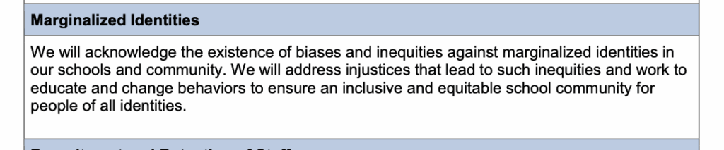 The section on Marginalized Identities reads, “We will acknowledge the existence of biases and inequities against marginalized identities in our schools and community. We will address injustices that lead to such inequities and work to educate and change behaviors to ensure an inclusive and equitable school community for people of all identities.”