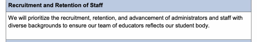 The following section titled “Recruitment and Retention of Staff” acknowledges that the district will “prioritize the recruitment, retention, and advancement of administrators and staff with diverse backgrounds…”