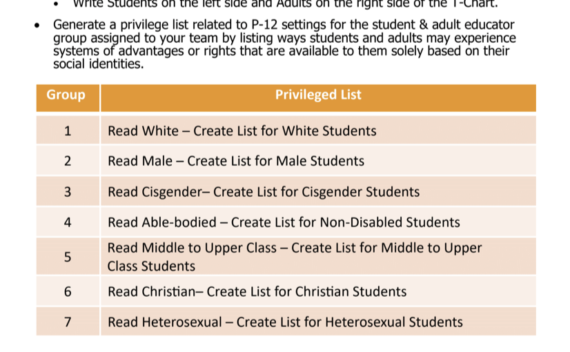 Privilege referred to students who were “White,” “Male,” “Cisgender,” “Able-bodied,” “Middle to Upper Class,” “Christian,” and/or “Heterosexual.” Teams were then asked to generate a list of ways those on the “Privileged List” experience “advantages or rights … solely based on their social identities.”