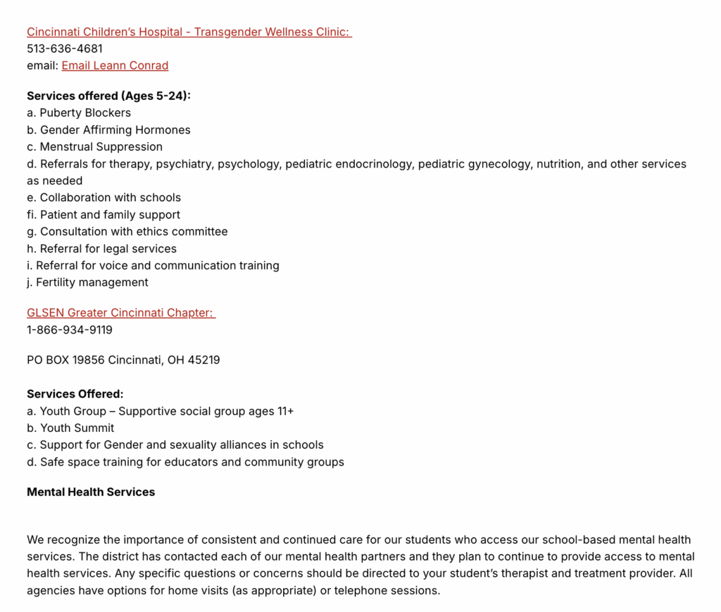 Princeton City Schools’ resources page features a link to the Cincinnati Children’s Hospital – Transgender Wellness Clinic and includes a list of “services offered” for ages 5-24 such as “puberty blockers,” “Gender Affirming Hormones,” “Menstrual Suppression,” and “Fertility management.”