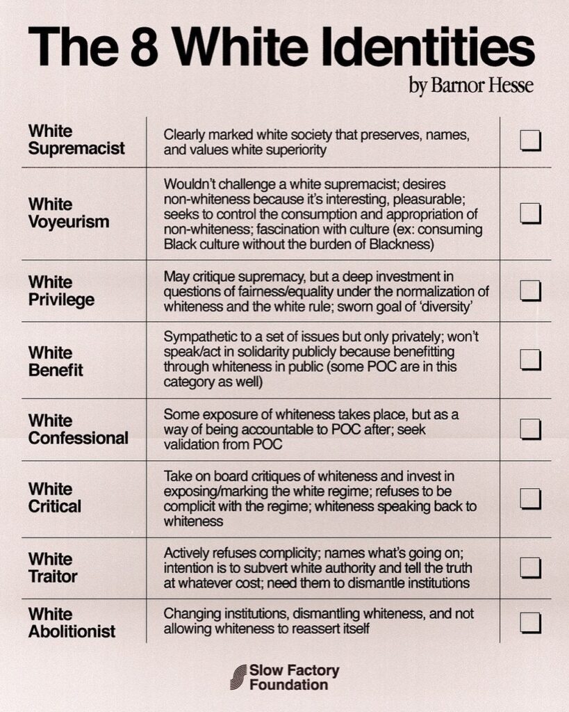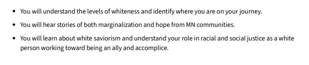 The first learning objective for the training is as follows: “You will understand the levels of whiteness and identify where you are on your journey.” Other objectives include hearing stories of marginalization and hope, learning about “white saviorism,” and understanding one’s role in racial and social justice, in order to become an ally and accomplice.