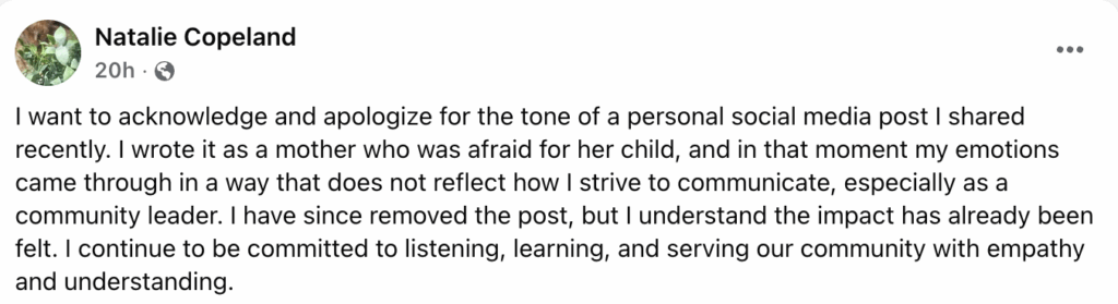She has since deleted that post from her page and posted an apology “for the tone of a personal social media post…” The full text of what she wrote on her personal Facebook page is below.