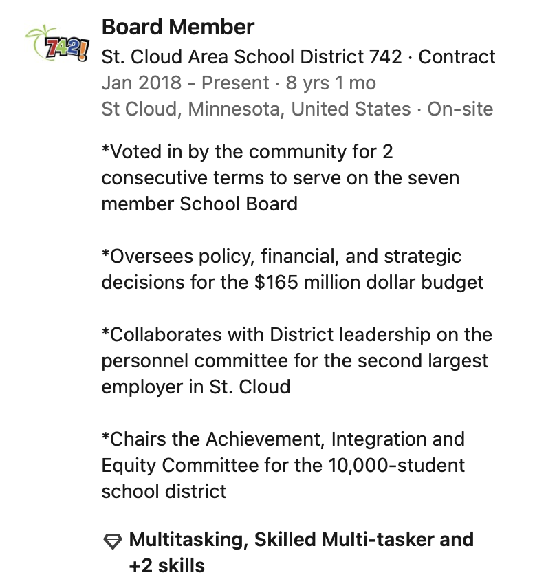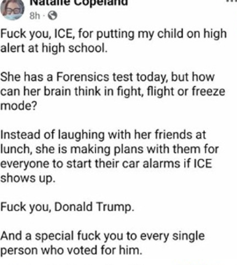 An elected board member to St. Cloud Area School District 742 in 2018–allegedly posted to her personal Facebook page, “Fuck you, ICE, for putting my child on high alert at high school…Instead of laughing with her friends at lunch, she is making plans with them for everyone to start their car alarms if ICE shows up. Fuck you, Donald Trump. And a special fuck you to every single person who voted for him.”