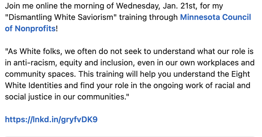 This board member is also set to host a training course on “Dismantling White Saviorism” through the Minnesota Council of Nonprofits. As written in her advertisement for the January 21st training, “‘As White folks, we often do not seek to understand what our role is in anti-racism, equity and inclusion, even in our own workplaces and community spaces. This training will help you understand the Eight White Identities and find your role in the ongoing work of racial and social justice in our communities.'”