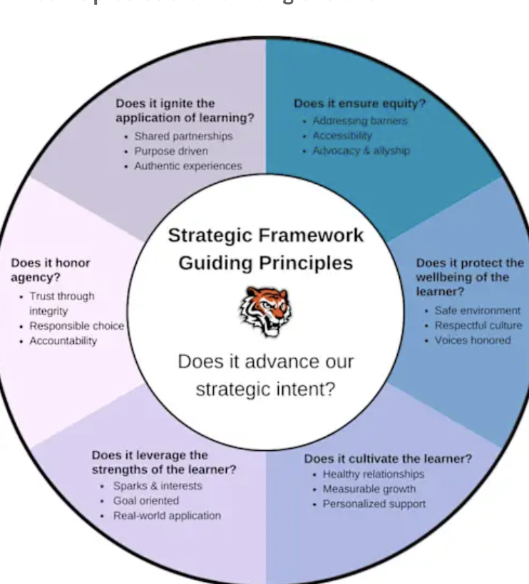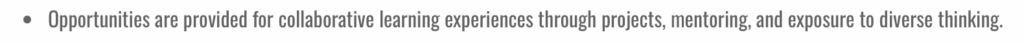 The final strategy mentioned in this guide reads: “We will give knowledge meaning.” Under this strategy, “Opportunities are provided for collaborative learning experiences through projects, mentoring, and exposure to diverse thinking.”