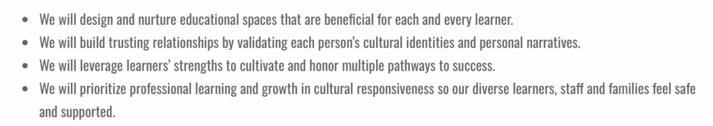 Under Farmington’s Strategies Community Companion Guide, the school states, “We will build trusting relationships by validating each person’s cultural identities and personal narratives….We will prioritize professional learning and growth in cultural responsiveness so our diverse learners, staff and families feel safe and supported.”