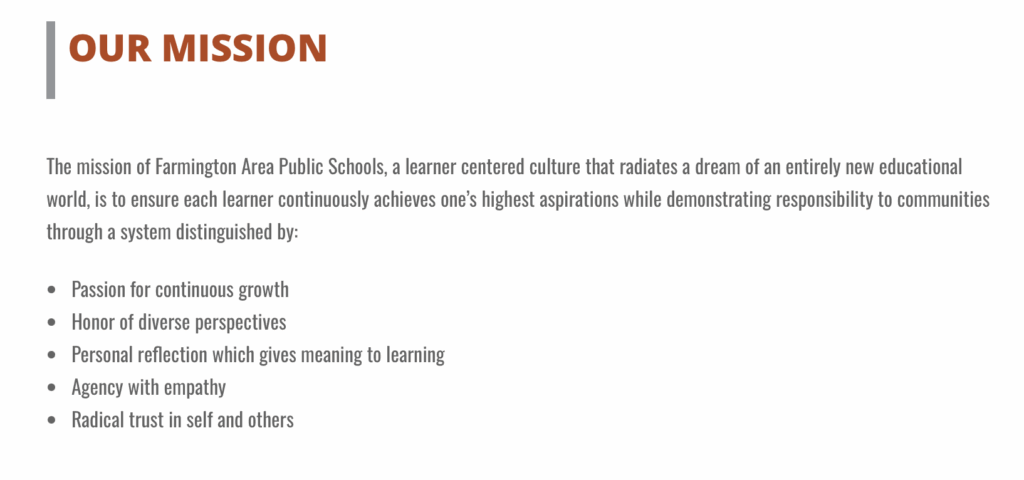 According to the Farmington Area Public Schools website, “a learner centered culture that radiates a dream of an entirely new educational world, is to ensure each learner continuously achieves one’s highest aspirations while demonstrating responsibility to communities” through a system that includes an emphasis on diverse perspectives. The mission statement in its entirety is shown below.