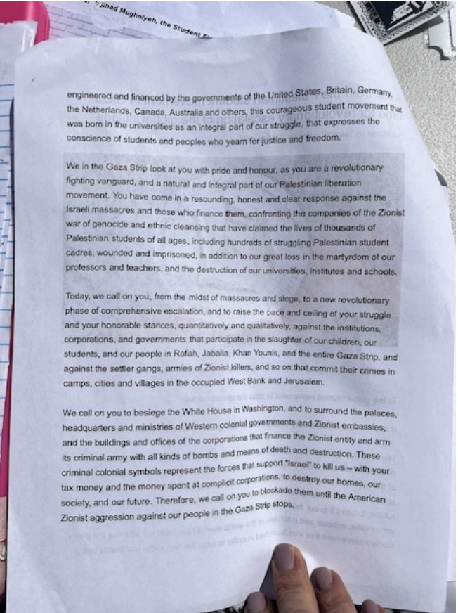 Another document stated: “Resistance is justified when people are occupied. Palestine has suppered from colonization, dispossession, displacement, murder and occupation for more than 75 years. As Malcom X said, the oppressed have the legitimate right to fight back ‘by any means necessary!'”