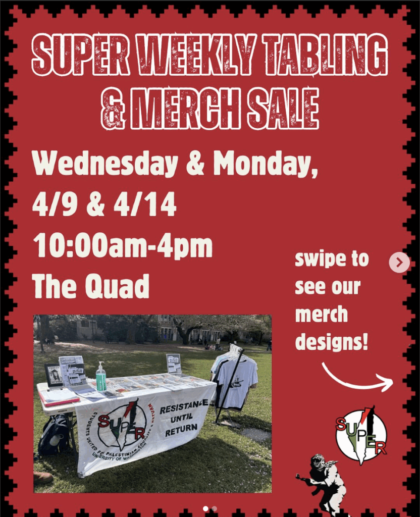 A de-certified student organization at the University of Washington, Super UW, which stands for Students United for Palestinian Equality and Return, was tabling and selling merchandise on campus in April, where they actively promoted violence and displayed material from the Hamas Media Office.