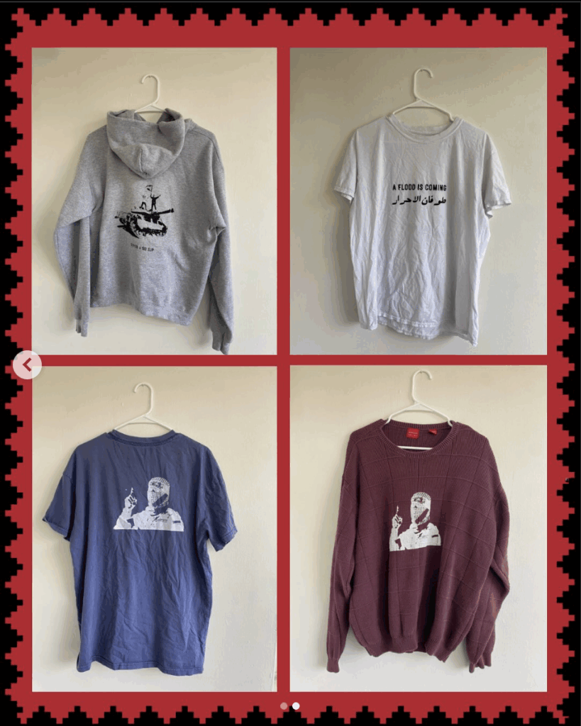 T-shirts sold included what appears to be an image of Hamas leader and October 7 mastermind, Yahya Sinwar, as well as photographs from the terrorist attack and the statement “A flood is coming,” in reference to October 7.