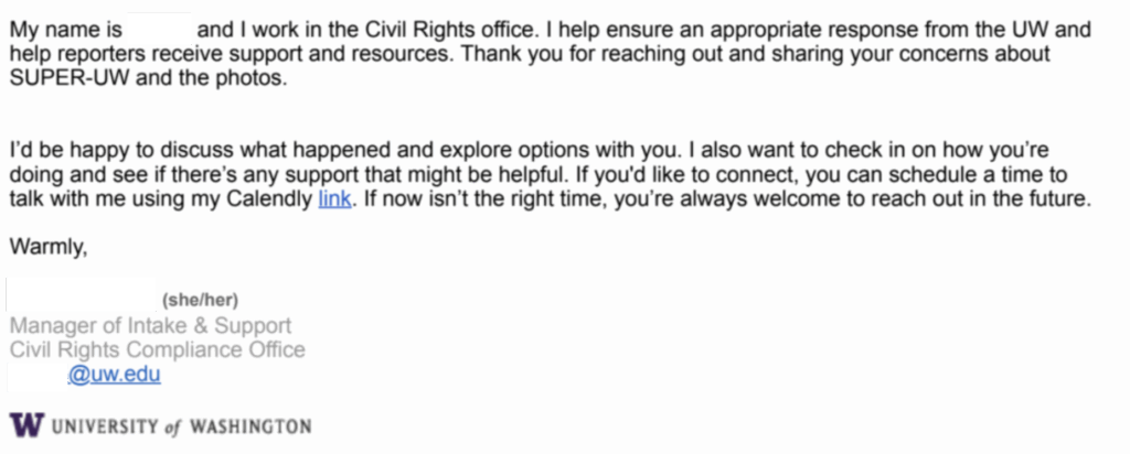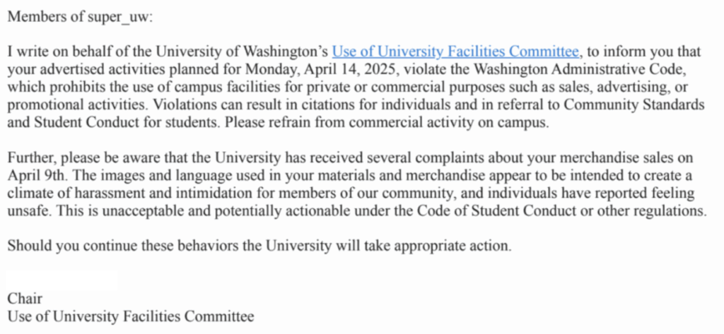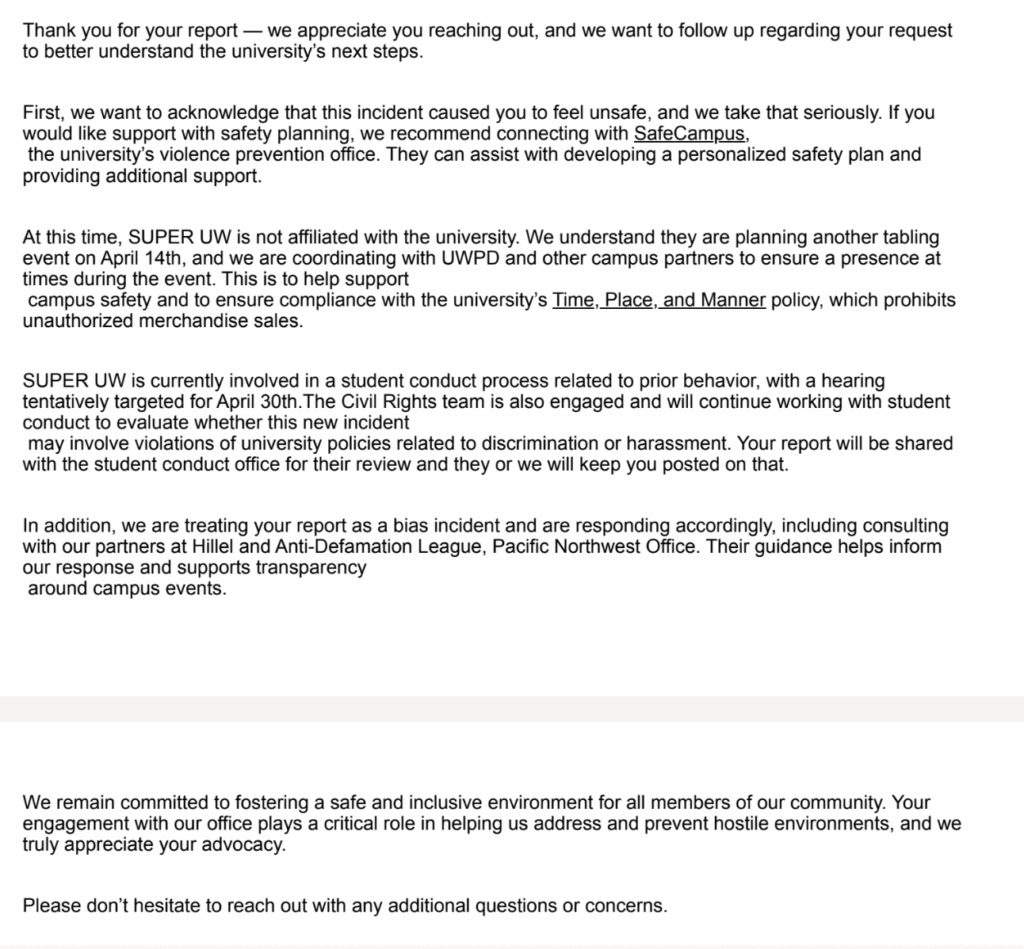 The Civil Rights Office followed up, clarifying that Super UW is not affiliated with the university and that the office was coordinating with campus police to ensure safety and company with time, place and manner policy, which prohibited unauthorized merchandise sales.