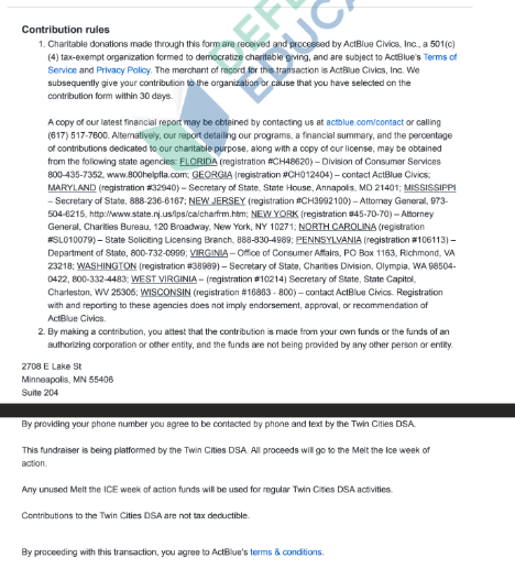 Fundraising for the “Week of Action” is being platformed by Twin Cities DSA through ActBlue. The site also states that “any unused Melt the ICE week of action funds will be used for regular Twin Cities DSA activities” and that “contributions to the Twin Cities DSA are not tax deductible.”
