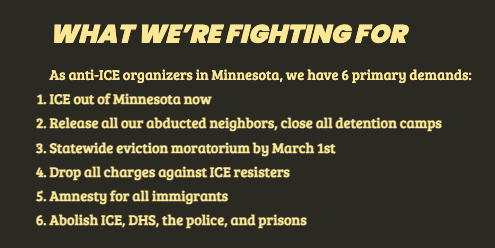 The “Week of Action” is “centered around six demands to protect the people from ICE” which includes “ICE out of Minnesota now and forever,” “release all our abducted neighbors, close all detention camps,” “Statewide eviction moratorium by March 1st,” “drop all charges against ICE resistors,” “amnesty for all immigrants,” and “abolish ICE, DHS, the police, and prisons.”