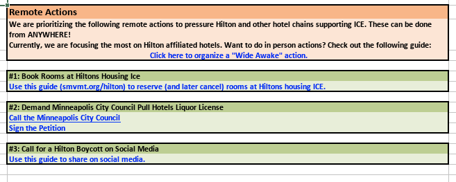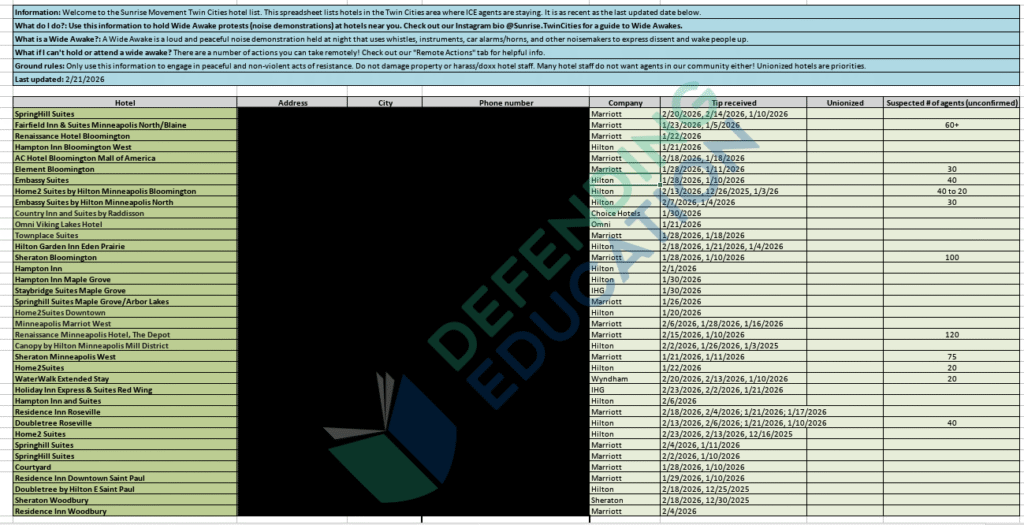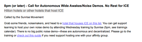 Sunrise Movement is facilitating multiple “Wide Awake/Noise Demonstrations” throughout the week targeting local hotels and for activists to engage in “remote actions to pressure Hilton and other hotel chains supporting ICE.” Other “remote actions” include reserving rooms and later canceling them at hotels suspected of housing ICE, demanding that Minneapolis City Council “pull hotels liquor license,” and calling for a general boycott of Hilton hotels on social media. The group also includes a list of hotels where community members have submitted tips about suspected ICE agents staying in that specific hotel.