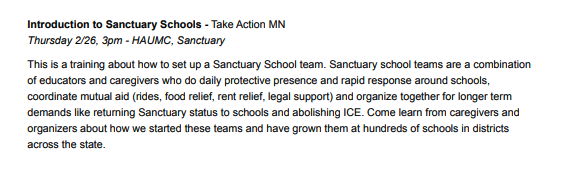 The session “Introduction to Sanctuary Schools” states that it is “about how to set up a Sanctuary School team,” which includes a “combination of educators and caregivers who do daily protective presence and rapid response around schools, coordinate mutual aid (rides, food relief, rent relief, legal support) and organize together for long term demands like returning Sanctuary status to schools and abolishing ICE.” Facilitated by Take Action MN, the session highlights how these “teams” have grown at “hundreds of schools in districts across the state.”
