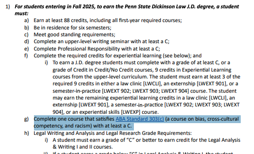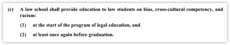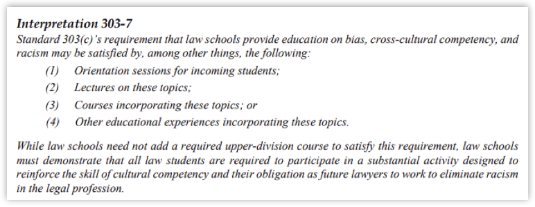The ABA’s Rules of Procedure, Standard 303(c), requires law schools to “provide education to law students on bias, cross-cultural competency, and racism” at the start of their program and at least once again before graduation. The requirement may be satisfied by orientation sessions, lectures, courses, or “other educational experiences.”