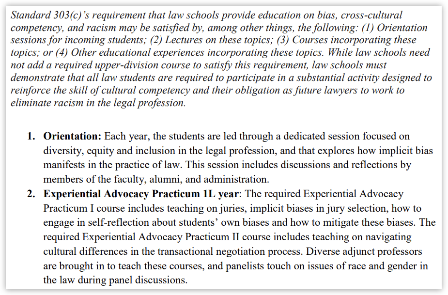 The school also touted several other Standard 303 compliance efforts including upper-level requirements and DEI-related elective options.