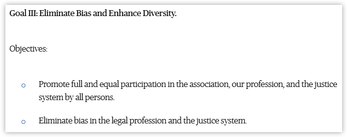 The ABA’s mission consists of four goals, including Goal III: “Eliminate Bias and Enhance Diversity.” Specifically, Goal III calls to “eliminate bias in the legal profession and the justice system.”