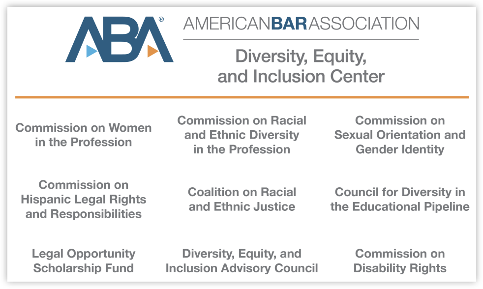 The ABA’s Diversity, Equity, and Inclusion Center “provides guidance, spearheads projects, and enhances collaboration and communication to advance ABA Goal III.” The DEI Center houses nine entities charged with advancing Goal III, such as the “Coalition on Racial and Ethnic Justice,” the “Commission on Sexual Orientation and Gender Identity,” and the “Diversity, Equity, and Inclusion Advisory Council.”