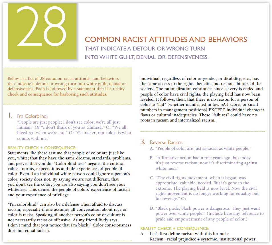 The article detailed behaviors that “indicate a detour or wrong turn into white guilt, denial or defensiveness,” followed by a “reality check and consequence for harboring such attitudes.”