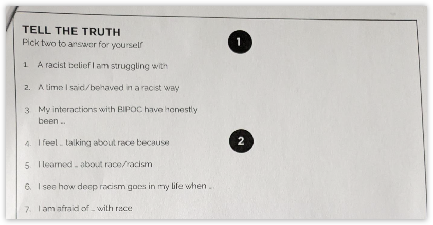 A worksheet titled “Tell the Truth” instructed students to respond to prompts from a list, including a “racist belief I am struggling with,” a “time I said/behaved in a racist way,” and “how deep racism goes in my life.”