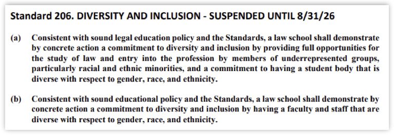 The following includes information about Standards 206 and 303(c), and the most current links to law schools that appear to still be requiring adherence to DEI standards. This is not a comprehensive report and will be updated as new information comes to light.