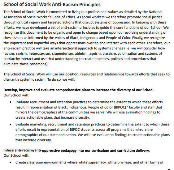 - Coppin State University’s (MD) Department of Social Work states that its mission is “grounded in anti-racism, diversity, equity, and inclusion” and is committed to “Black liberatory frameworks, cultural humility, and anti-oppressive practices.”