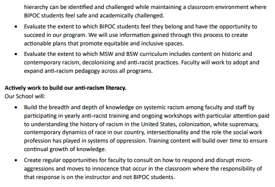- The University of Portland’s (OR) Dorthy Day Social Work Program prioritizes “Anti-racism and Critical Race Theory (CRT), which names the impact of historical racism on modern life and is grounded in uplifting the race-conscious experiences of Black, Indigenous, People of Color (BIPOC) in order to radically shift dominant narratives which often obscure and constrain BIPOC expressions and insights.”