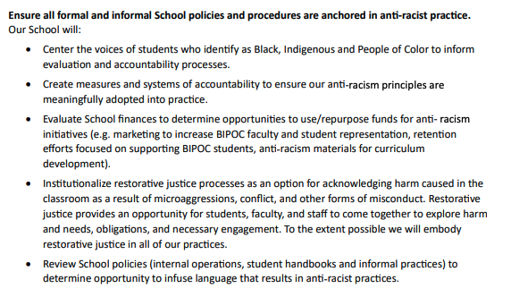 The school’s “Anti-Racism Principles” notes that it has “developed a set of anti-racism principles to guide the core functions of our School” which includes an “intersectional approach to systems change (i.e. we will consider how racism, sexism, heterosexism, cisgenderism, ableism, ageism, classism, colonization and systems of patriarchy interact and use that understanding to create practices, policies and procedures that eliminate those conditions).”