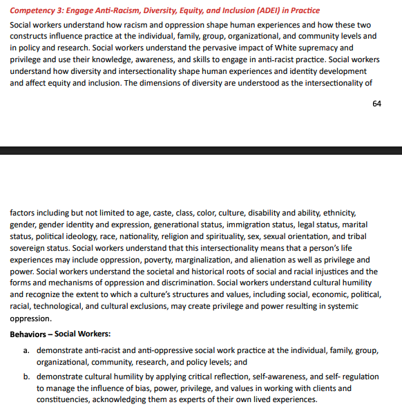 Competency three states that social workers will “understand how racism and oppression shape human experiences,” will “understand the pervasive impact of White supremacy and privilege and use their knowledge, awareness, and skills to engage in anti-racist practice.” Social workers are also expected to “understand that this intersectionality means that a person’s life experiences may include oppression, poverty, marginalization, and alienation as well as privilege and power.”