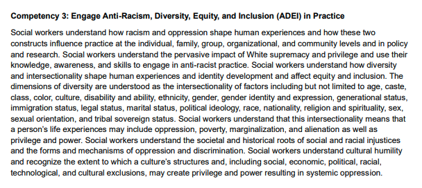 The Council on Social Work Education’s (CSWE) 2022 Educational Policy and Accreditation Standards (EPAS) for Baccalaureate and Master’s Social Work Programs requires that students are learning to integrate anti-racism, diversity, equity, and inclusion (ADEI) and anti-oppressive lenses into their practice.