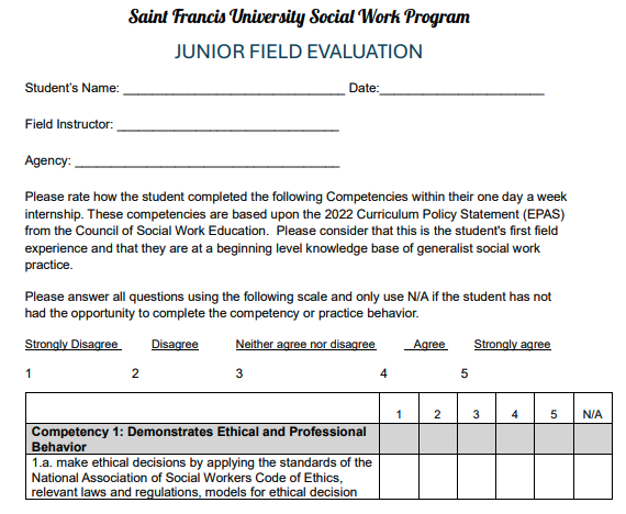 The fall 2025 course SWU 412 is the first of two semesters of the social work practicum experience for bachelor’s students. The BSW Learning Contract and Evaluation document associated with the course includes a rubric for evaluating student progress towards the mastery of the different EPAS competencies.