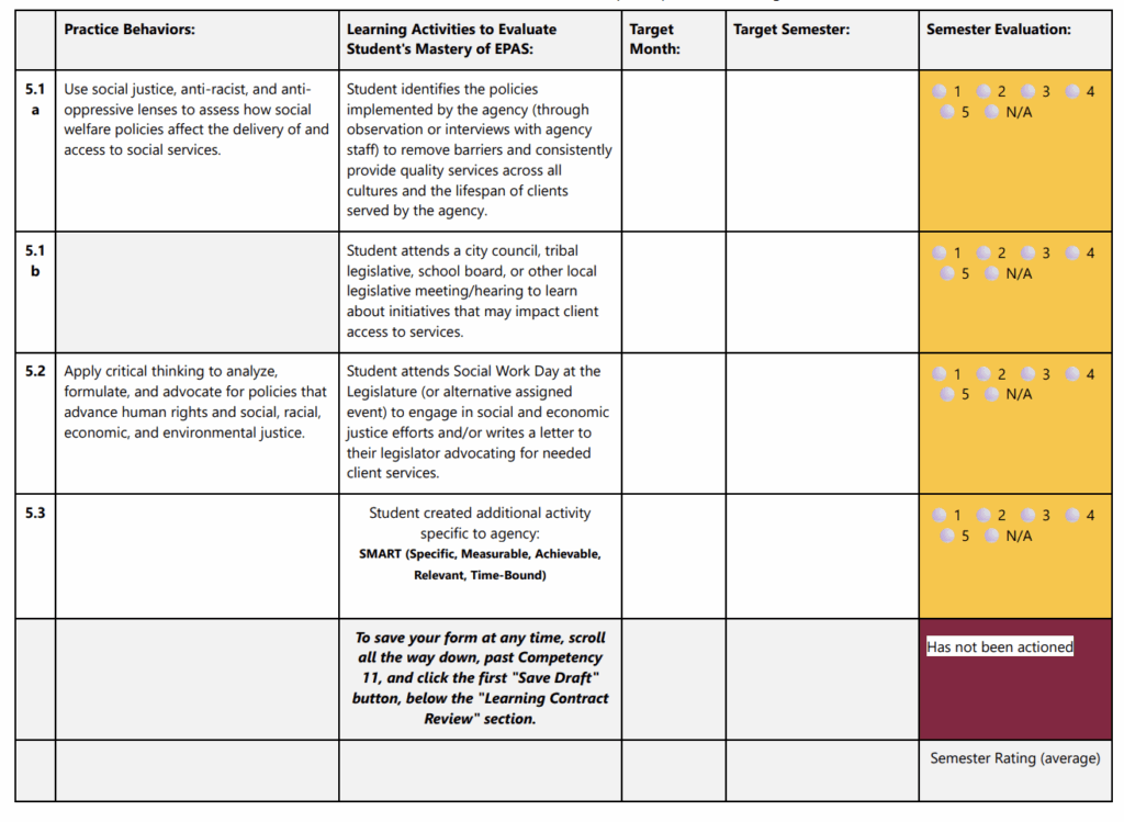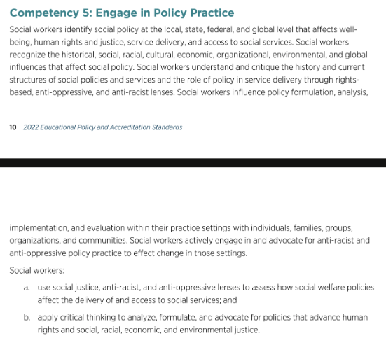 Under “Competency 5: Engage in Policy Practice,” the student is expected to “use social justice, anti-racist, and anti-oppressive lenses to assess how social welfare polices affect the diversity of and access to social services.”