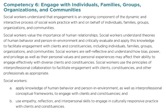 Competency 6: Engage with Individuals, Families, Groups, Organizations, and Communities