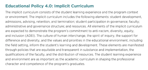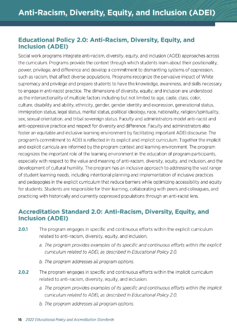Accredited programs must incorporate “Educational Policy 2.0” which requires integration of “anti-racism, diversity, equity, and inclusion (ADEI) approaches across the curriculum.” Programs are to “recognize the pervasive impact of White supremacy and privilege and prepare students to have the knowledge, awareness, and skills necessary to engage in anti-racist practices.” It also states that “faculty and administrators model anti-racist and anti-oppressive practice and respect for diversity and difference.”