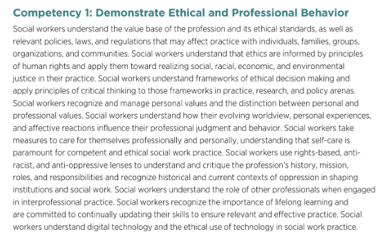 The first competency states that social workers “use rights-based, anti-racist, and anti-oppressive lenses to understand and critique the profession’s history, mission, roles, and responsibilities and recognize historical and current contexts of oppression in shaping institutions and social work.”