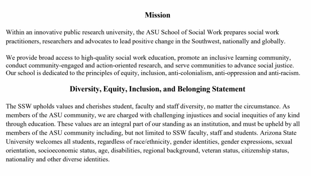 Arizona State University’s School of Social Work Practicum Manual 2025 states that the school is “dedicated to the principles of equity, inclusion, anti-colonialism, anti-oppression and anti-racism.”